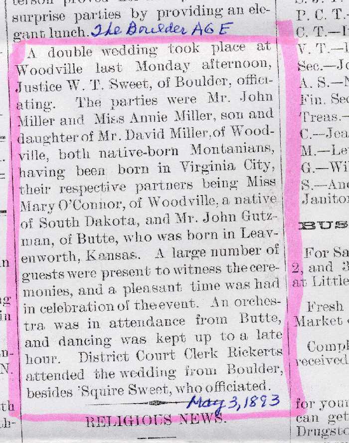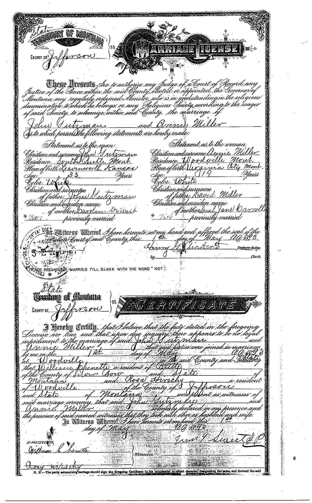 In Butte he continued to haul freight and there met Annie Urilla Miller. He Married Annie in a double ring ceremony on May 1, 1893.